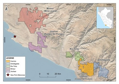 El propuesto Puerto de San Juan de Marcona representa una ventaja estratégica significativa para el proyecto de cobre Costa de Cobre de Camino y para el sector minero en general en el sur de Perú. Ubicado aproximadamente a 125 km de Costa de Cobre, con acceso directo a través de la Panamericana Sur, se espera que el nuevo puerto enfocado en minería mejore la logística y la eficiencia al reducir las distancias de transporte y disminuir los costes de exportación de cobre en la zona. Con una capacidad planificada de hasta 47 millones de toneladas por año y una infraestructura diseñada para manejar envíos a granel de minerales, el puerto puede aumentar la viabilidad económica de proyectos en etapa de desarrollo al mejorar los márgenes operativos y el VAN (valor actual neto) del proyecto. El proyecto portuario propuesto podría permitir el crecimiento minero en la región, proporcionando mayor potencial de inversión y fortaleciendo la posición de Perú como productor de cobre competitivo a nivel mundial.